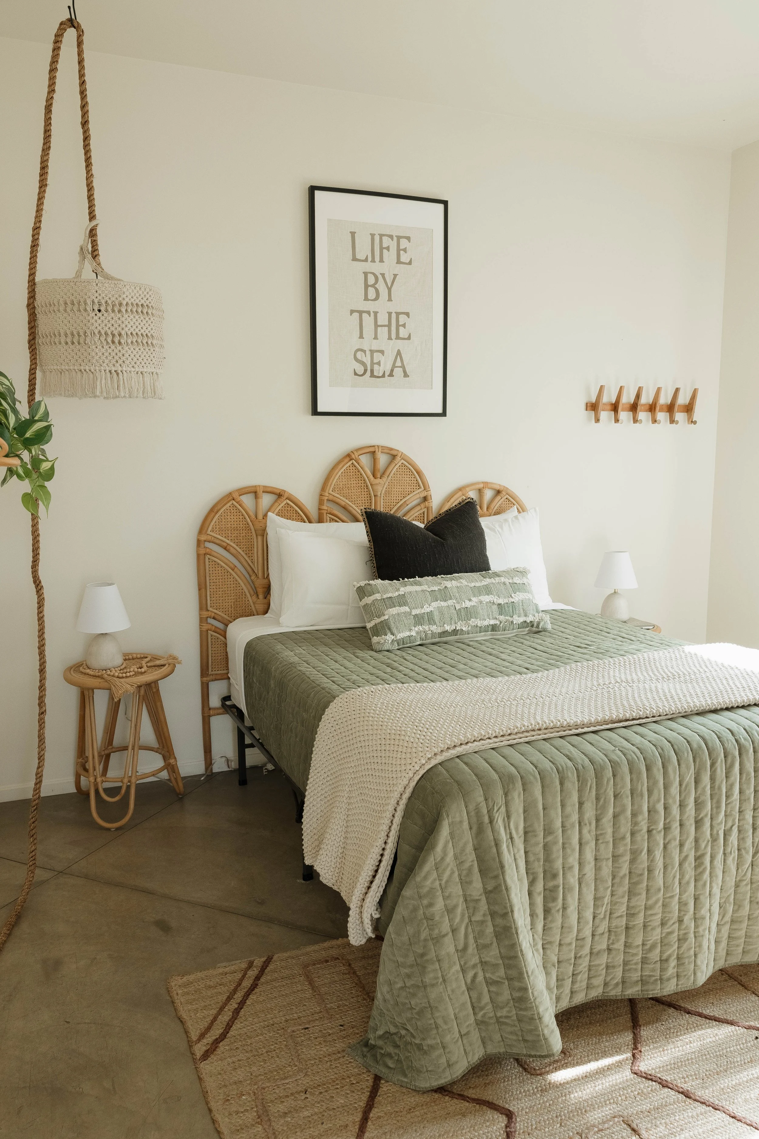 Materials: The style incorporates natural textures such as rattan, jute, linen, and raw wood. Organic elements like wicker furniture, woven baskets, and driftwood accents contribute to the overall aesthetic, as do light finishes such as whitewashed wood and soft, matte surfaces.